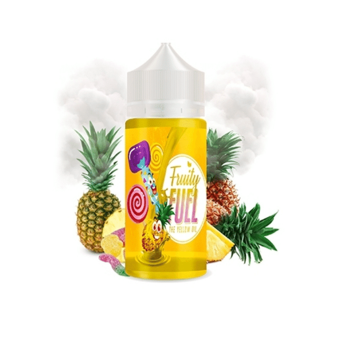 Le E-liquide Fuel The Yellow Oil 100ml 0mg offre des saveurs d’ananas et de bonbon, combinant fraîcheur et douceur sucrée.