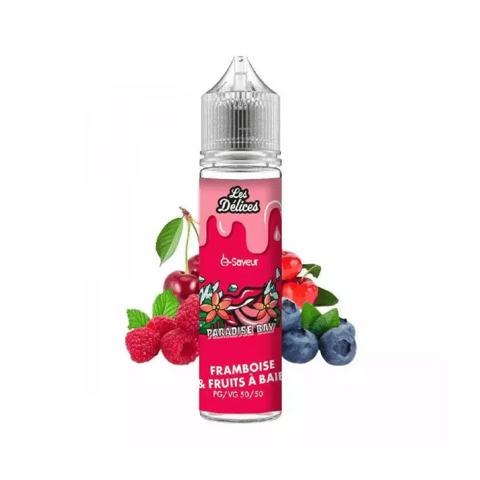 L’E-liquide Les Délices Framboise Fruits à Baies à Booster offre une saveur combinée de framboise et de fruits des bois.