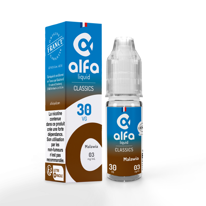 Surprenez vos papilles avec un mélange puissant que vous offre le e-liquide Classic Malawia produit par la marque française Alfaliquid issu de la gamme Alfaliquid 70/30. L’eliquide Malawia vous invite à déguster un merveilleux classic brun qui a fait l’unanimité auprès des vapoteurs exigeants. En effet, ce juice incontournable déploie les saveurs d’un tabac brun doux accompagné de notes de miel gourmandes.