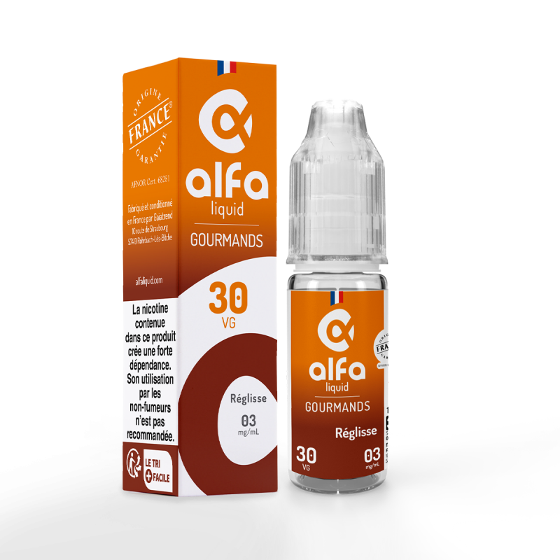 Le Réglisse Alfaliquid est disponible en flacon de 10 ml et propose un taux PG/VG de 70/30.